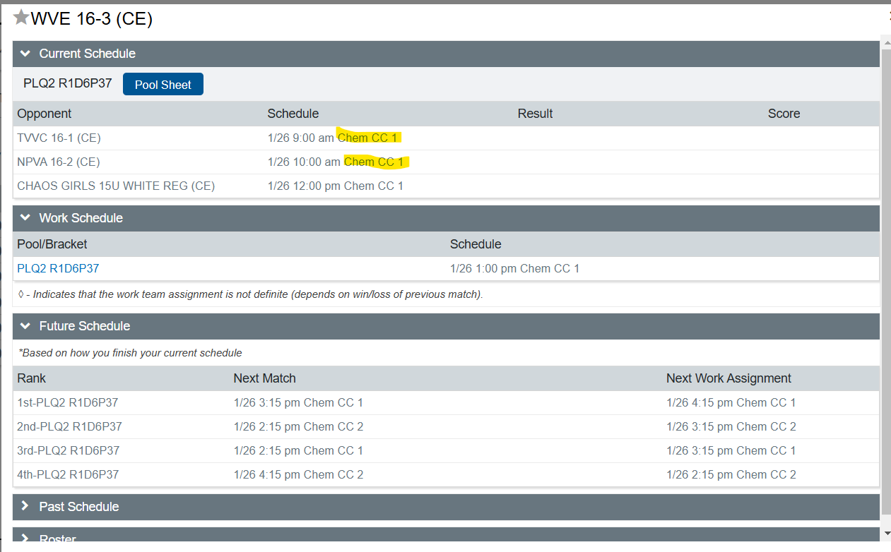 Example of what schedule will look like on AES- From here you can see the facilities code highlighted in yellow and the schedule. In the example below CHEM CC is the code for Chemeketa Community college. All schedules start at 8am so since there isn’t one showing here the team is off during the first match. You will see coaches interpret this schedule and write it out like this: